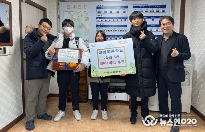 (뉴스인020 = 김성길 기자) 광명시 하안북중학교 2학년 5반 학생들은 지난 24일 연말을 맞아 지역 내 어려운 이웃을 돕기 위해 ‘학생 1인 1라면 기부’ 활동으로 모은 라면 1박스를 하안1동 지역사회보장협의체에 전달했다.