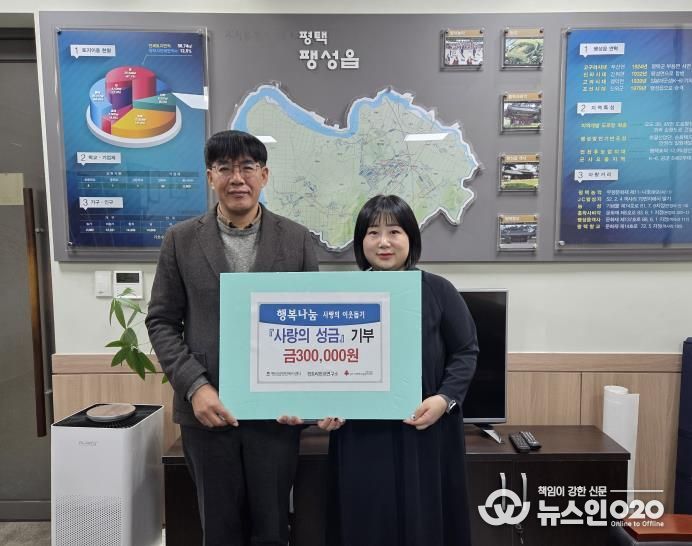 (뉴스인020 = 김성길 기자) 경토리민요연구소의 박정은 대표는 지난 24일, 팽성읍 행정복지센터를 방문해 저소득 가구 지원을 위한 성금 30만 원을 전달했다.