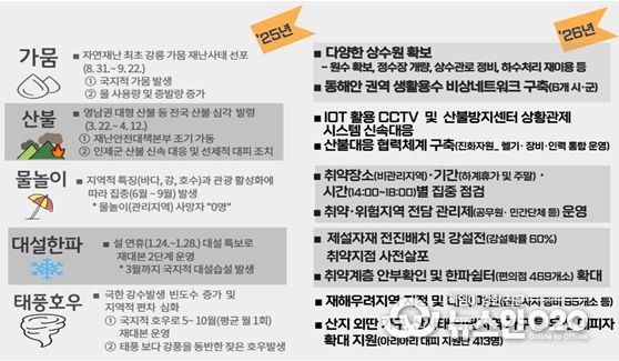 지난해와 달리, 최근 주요 재난을 바탕으로 지역 현장에서 실질적으로 작동할 수 있는 대책(강원 아리아리 대피지원단, 민생지원본부, GIS기반 재난 예·경보 통합시스템 등)을 한층 강화하고, 2025년부터 처음 시행된 안전관리계획 분석·평가 결과에 따라 전년도 문제점 및 미흡사항 등을 보완하여 작성했다.