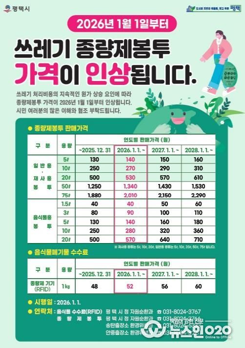 (뉴스인020 = 김성길 기자) 평택시는 2026년 1월 1일부터 쓰레기 종량제 봉투 가격을 3개년도에 걸쳐 인상한다.
