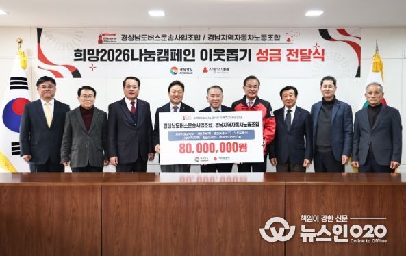 (뉴스인020 = 김성길 기자) 경상남도는 29일 도청 소회의실에서 경남버스운송사업조합(이사장 양기환)과 경남지역자동차노동조합(위원장 박지훈)이 도내 취약계층을 돕기 위한 성금 8천만 원을 전달했다고 밝혔다.