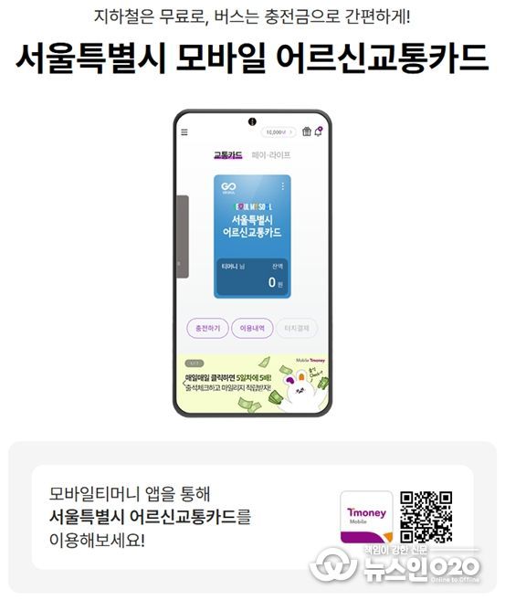 (뉴스인020 = 김성길 기자) 서울시는 실물 카드 없이 스마트폰만으로 편리하게 지하철 탑승이 가능한 ‘모바일 어르신 교통카드’ 시범서비스를 선보인다고 밝혔다.