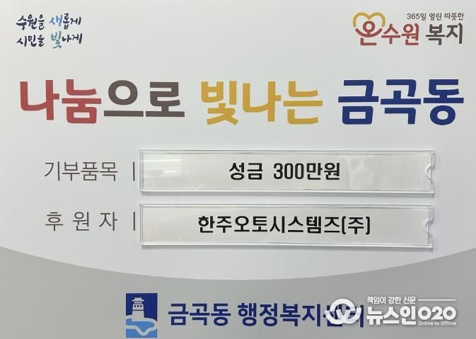 (뉴스인020 = 기자) 지난 29일 수원시 권선구 금곡동 행정복지센터는 한주오토시스템즈(주)로부터 저소득 가정을 지원하기 위한 성금 300만 원을 전달받았다고 밝혔다.