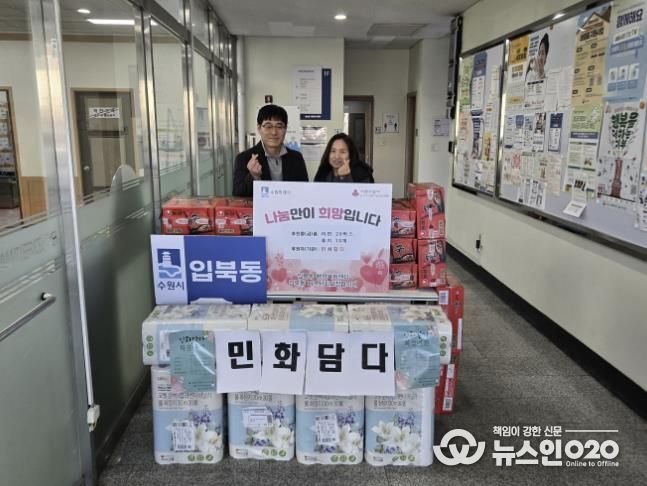 (뉴스인020 = 기자) 지난 26일, 당수동 소재 ‘민화담다’는 입북동 행정복지센터를 방문해 라면 20박스, 휴지 10개를 전달했다.