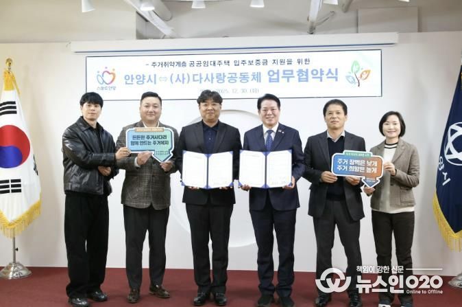(뉴스인020 = 김성길 기자) 안양시는 30일 오전 10시 시청 3층 접견실에서 (사)다사랑공동체와 ‘주거취약계층 공공임대주택 입주보증금 지원을 위한 업무협약’을 체결했다.