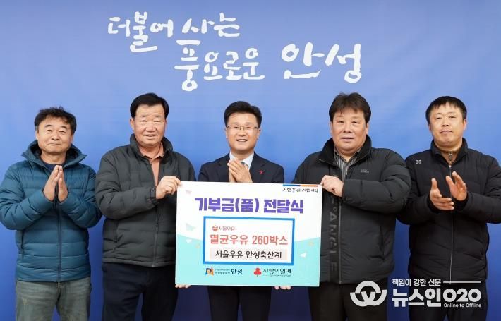 (뉴스인020 = 김성길 기자) 안성시는 지난 12월 29일, 서울우유 안성축산계와 ㈜스마트에스지가 연말을 맞아 어려운 이웃을 위한 나눔을 실천했다고 밝혔다.