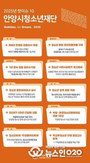 (뉴스인020 = 김성길 기자) 안양시청소년재단은 올 한 해를 돌아보는 ‘2025년 안양시 청소년재단 핫이슈 10’을 선정하고, 2025년 청소년 정책 컨트롤타워로서의 기능을 강화해 청소년 체감형 정책 성과를 거뒀다고 30일 밝혔다.