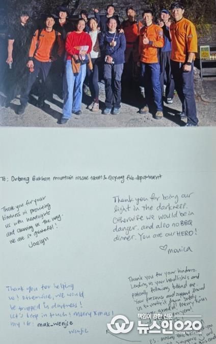 (뉴스인020 = 김성길 기자) 경기도 구조대원의 활동으로 자칫 생명을 잃을 수도 있는 상황에서 위기를 넘긴 외국인 관광객이 감사 편지를 보낸 사실이 알려져 화제다. 화제의 주인공들은 고양소방서 산악구조대.