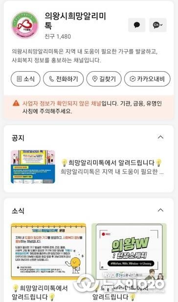 (뉴스인020 = 김성길 기자) 의왕시가 위기가구 및 복지사각지대 발굴하기 위한 ‘희망알리미톡’채널을 연중 운영하고 있다고 밝혔다.