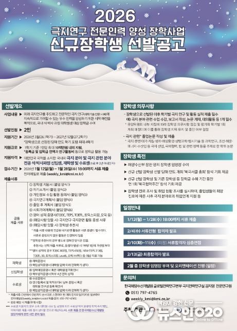 (뉴스인020 = 김나현 기자) 해양수산부는 1월 12일부터 1월 28일까지 ‘2026년 극지연구 전문인력 양성 장학사업’의 장학생을 모집한다고 밝혔다.