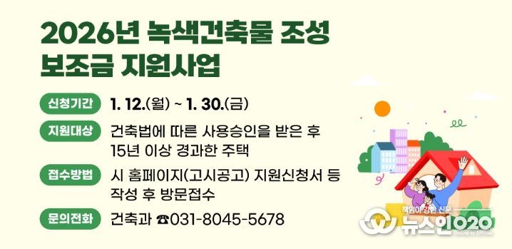 (뉴스인020 = 김성길 기자) 안양시는 높은 에너지 효율 달성 및 온실가스 배출 저감을 위해 노후한 건축물의 보수공사 비용을 지원하는 ‘2026년 녹색건축물 조성 보조금 지원사업’을 추진한다고 12일 밝혔다.