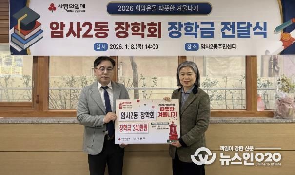 (뉴스인020 = 김성길 기자) 강동구 암사2동은 지난 8일, ‘2026년 희망온돌 따뜻한 겨울나기’ 사업의 일환으로 ‘암사2동장학회 장학금 전달식’을 개최했다고 밝혔다.