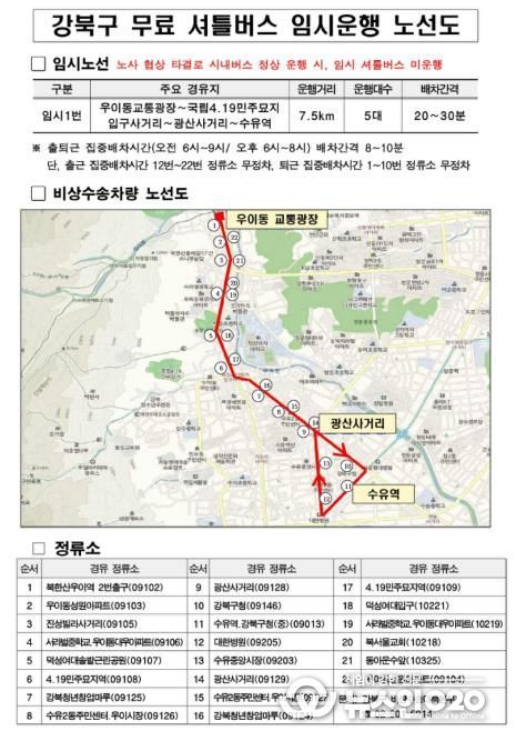 비상수송대책의 핵심으로, 구는 ‘임시 무료 셔틀버스(임시 1번)’를 운영하고 있다. 셔틀버스는 우이동 교통광장에서 수유역까지 약 7.5km 구간을 운행하며, 전세버스 10대가 투입돼 오전 6시부터 밤 10시까지 운행된다.