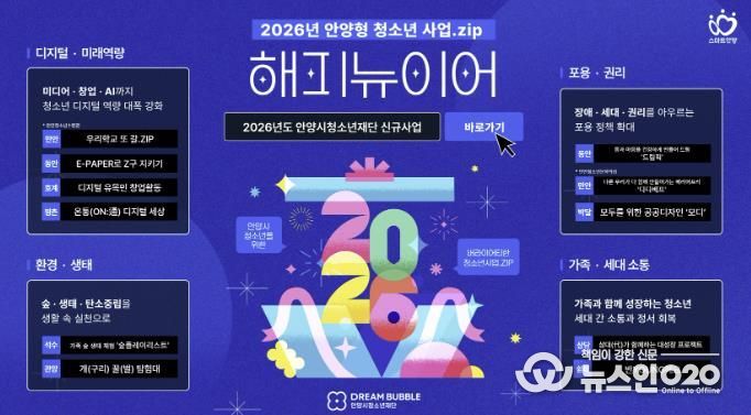 (뉴스인020 = 김성길 기자) 안양시청소년재단은 2026년을 맞아 ‘청소년이 주도하는 변화의 물결, 모두가 함께하는 지속 가능한 미래’라는 비전 아래 10개 소속 기관을 주축으로 신규사업을 본격 추진한다.