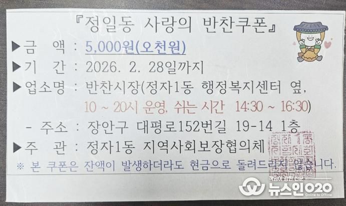 (뉴스인020 = 기자) 수원시 장안구 정자1동 지역사회보장협의체는 금년부터 관내 취약계층 가구를 대상으로 매월 5가구에 2만원 상당의 반찬쿠폰을 지급하는 사업을 시작한다고 지난 13일 밝혔다.