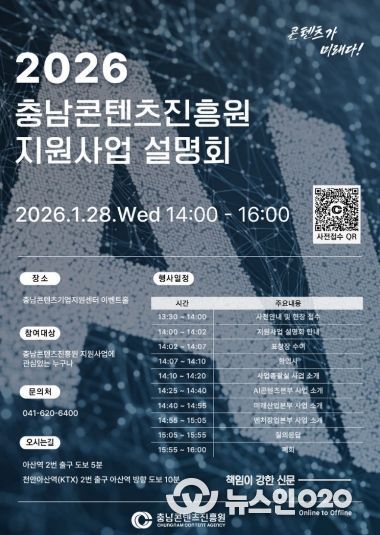 (뉴스인020 = 김성길 기자) (재)충남콘텐츠진흥원(원장 김곡미)은 오는 1월 28일 오후 2시, 충남콘텐츠기업지원센터 이벤트홀에서 ‘2026년 지원사업 설명회’를 개최한다고 밝혔다.