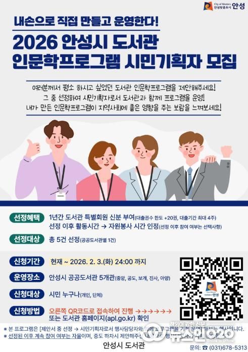 (뉴스인020 = 김성길 기자) 안성시는 ‘2026년 안성시 도서관 시민 공동기획 인문학프로그램’을 추진하며, 인문학 프로그램을 직접 기획하고 운영할 시민기획자를 오는 2월 3일까지 모집한다고 밝혔다.