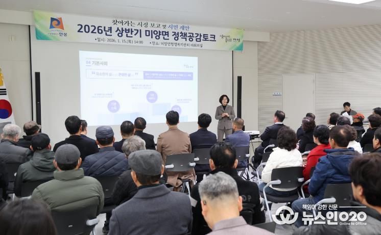 (뉴스인020 = 김성길 기자) 안성시 미양면은 지난 1월 15일, 미양면행정복지센터 대회의실에서 주민 120여 명이 참석한 가운데 ‘2026년 상반기 미양면 정책공감토크’를 성황리에 개최했다.