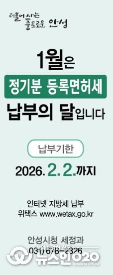 안성시 관계자는 “등록면허세 납부기한은 2월 2일까지로, 납기 마지막 날에는 민원인이 몰려 혼잡하거나 온라인 접속이 지연될 수 있으므로 조기 납부를 부탁드린다”고 당부했다.