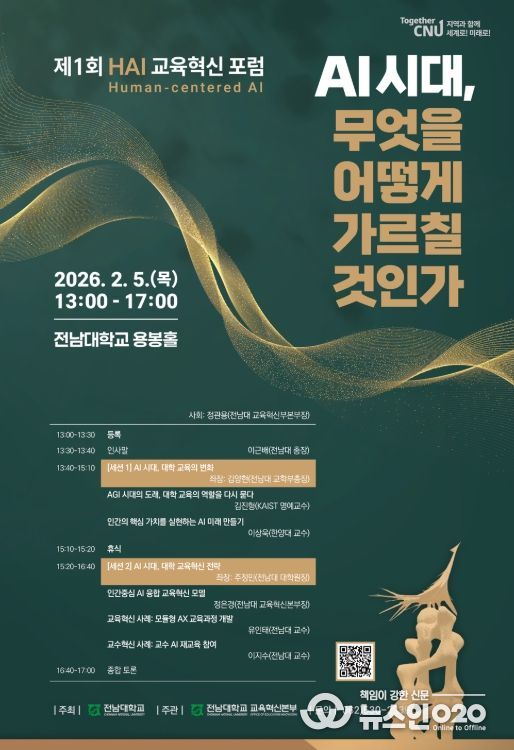 (뉴스인020 = 김성길 기자) 전남대학교가 오는 2월 5일 오후 1시 전남대 국제회의동 용봉홀에서 ‘제1회 HAI(Human-centered AI) 교육혁신 포럼’을 개최하고, AI 시대에 대응하는 대학 교육의 새로운 이정표를 제시한다.