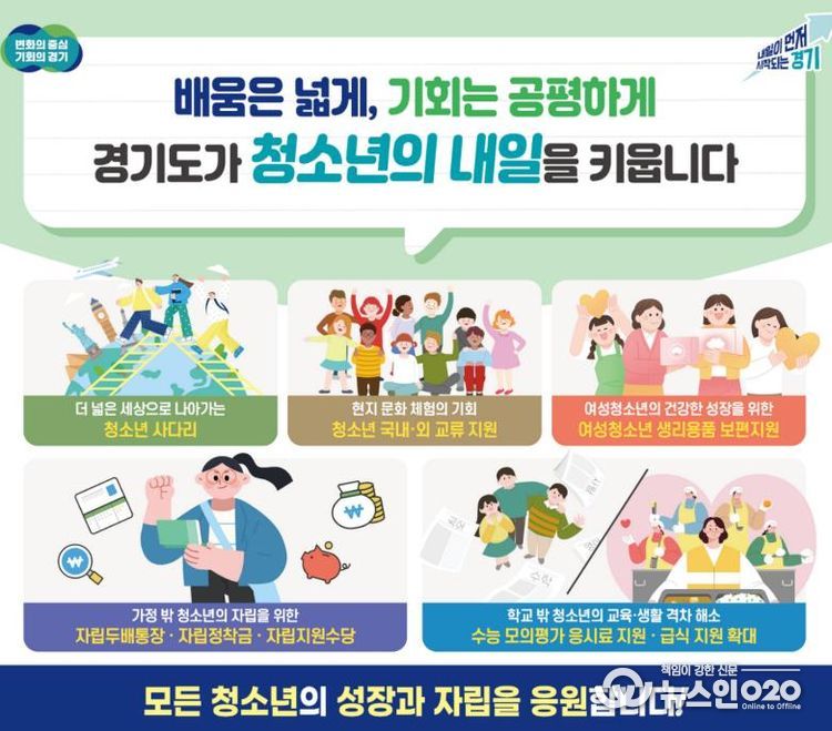 (뉴스인020 = 김성길 기자) 경기도가 청소년의 건강한 성장과 배움 기회, 생활 안정을 위해 급식, 학습·진로·자립 지원까지 아우르는 다양한 정책을 추진한다.