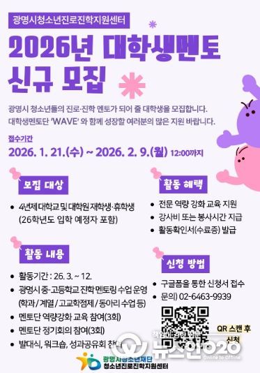 (뉴스인020 = 김성길 기자) 광명시청소년재단 청소년진로진학지원센터는 관내 중·고등학교 청소년 대상 학과 멘토링 운영을 위해 ‘2026년 대학생 멘토단(wave)’을 모집한다고 밝혔다.