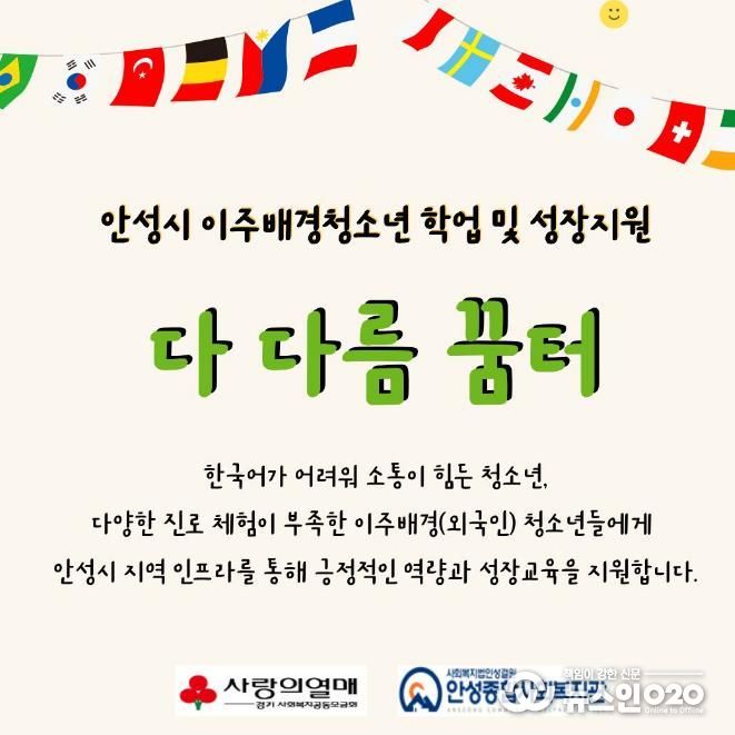 (뉴스인020 = 김성길 기자) 안성종합사회복지관은 경기사회복지공동모금회 지원으로 이주배경(외국인) 청소년 대상 학업·사회적응 지원사업 ‘다다름 꿈터’ 참여자를 1월 28일까지 모집한다.