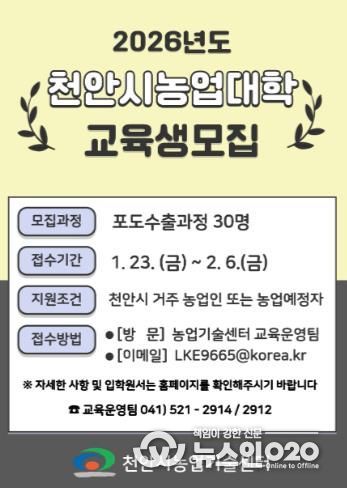 (뉴스인020 = 김성길 기자) 천안시농업기술센터는 내달 6일까지 ‘2026년도 천안시농업대학’ 교육생 30명을 모집한다고 23일 밝혔다.