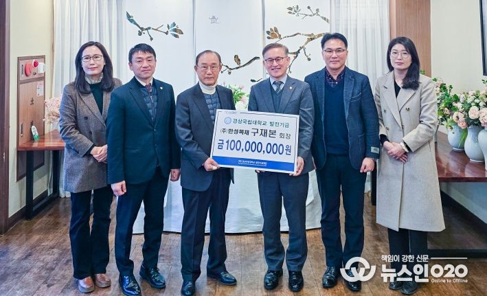 경상국립대학교(GNU·총장 권진회)는 1월 23일 낮 12시 경기도 안양시 소재 한송정에서 ‘(주)한성목재 구재본 회장 대학발전기금 전달식’을 개최했다. 전달식은 모교를 향한 구재본 회장의 각별한 애정과 나눔의 정신을 기리기 위해 마련했다.