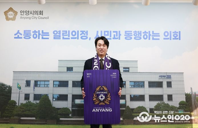(뉴스인020 = 김성길 기자) 안양시의회 박준모 의장이 1월 23일 시의회 의장실에서 2026시즌 FC안양 연간회원권을 구매했다.