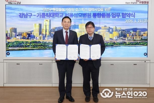 (뉴스인020 = 김성길 기자) 꿈이 모이는 도시, 미래를 그리는 강남구가 1월 23일 구청에서 가톨릭대학교 서울성모병원과 ‘강남구 통합돌봄 가정형 호스피스 협력사업’ 추진을 위한 업무협약(MOU)을 체결했다. 이 협약은 자치구와 상급종합병원이 연계해 가정형 호스피스를 지원하는 체계를 공식화했다는 점에서 그 의미가 크다.