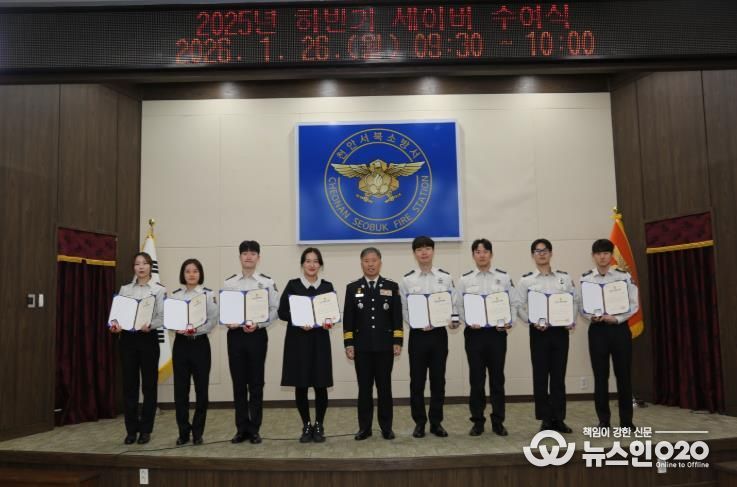 (뉴스인020 = 김성길 기자) 천안서북소방서는 26일 청사에서 심정지·중증외상·뇌혈관 질환 등 위급한 상황에서 신속하고 전문적인 현장 대응으로 소중한 생명을 구한 구급대원들을 대상으로 하트·브레인·트라우마 세이버 수여식을 개최했다.
