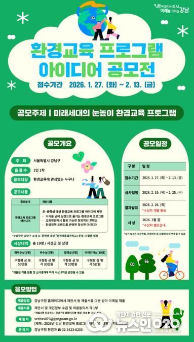 (뉴스인020 = 김성길 기자) 꿈이 모이는 도시, 미래를 그리는 강남구가 학교 현장에서 바로 활용할 수 있는 환경교육 콘텐츠를 발굴하기 위해 ‘2026년 강남 환경교육 프로그램 공모전’을 1월 27일부터 2월 13일까지 진행한다.