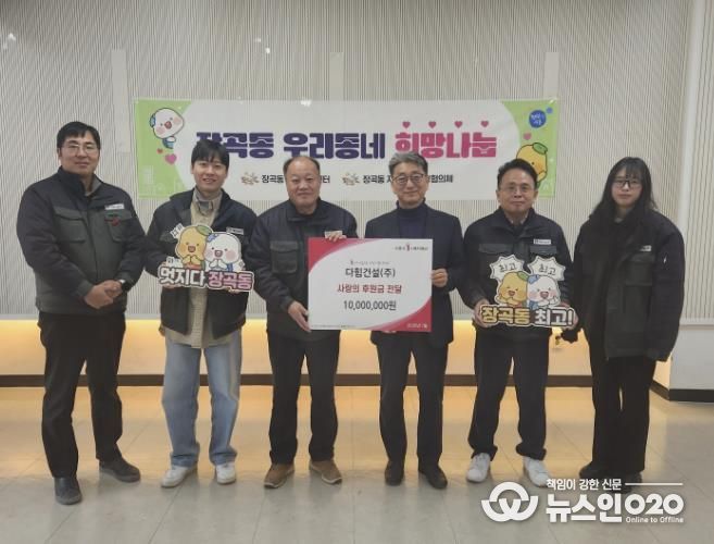(뉴스인020 = 김성길 기자) 시흥시 장곡동 행정복지센터에 지난 1월 26일 다힘건설(주)이 방문해 지역 내 어려운 이웃을 돕기 위한 사랑의 후원금 1천만 원을 전달했다.