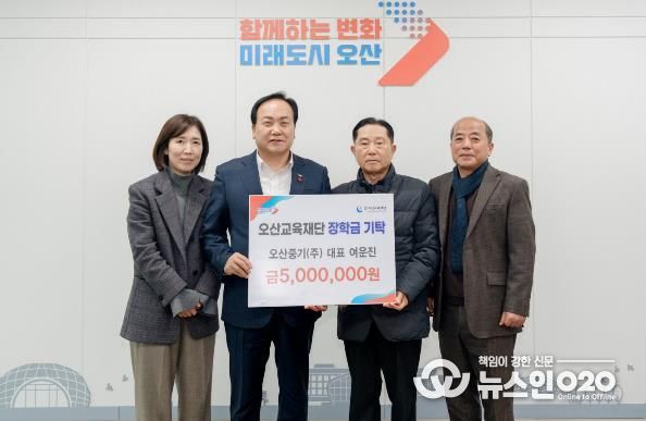 이권재 오산시장은 “지역사회를 위해 꾸준히 나눔을 실천해 주고 계신 여운진 대표님께 진심으로 감사드린다”며 “기탁해 주신 장학금은 오산 학생들이 꿈과 재능을 마음껏 펼칠 수 있도록 소중히 활용하겠다”고 밝혔다.