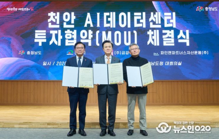 천안시는 29일 충남도청에서 김석필 천안시장 권한대행 부시장, 김태흠 충남도지사, 김용성 ㈜금강 회장이 참석한 가운데 ‘AI 데이터센터’ 건립을 위한 투자협약을 체결했다고 밝혔다.