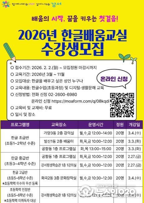 (뉴스인020 = 김성길 기자) 서울 강서구는 배움의 기회를 놓친 성인들의 문해 능력 향상을 돕기 위해 ‘한글배움교실’ 수강생을 모집한다고 밝혔다.