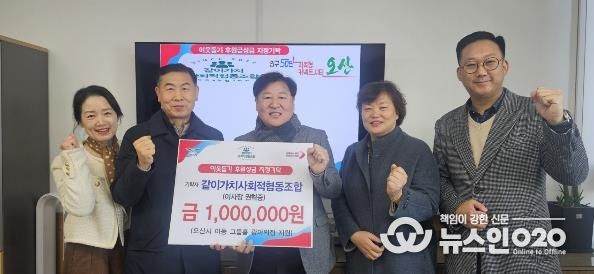 (뉴스인020 = 김성길 기자) 오산시는 지난 30일, 같이가치사회적협동조합으로부터 관내 아동공동생활가정(그룹홈)인 ‘광야의집’ 입소 아동을 위한 후원성금 100만 원을 기탁받고 기탁식을 가졌다고 밝혔다.