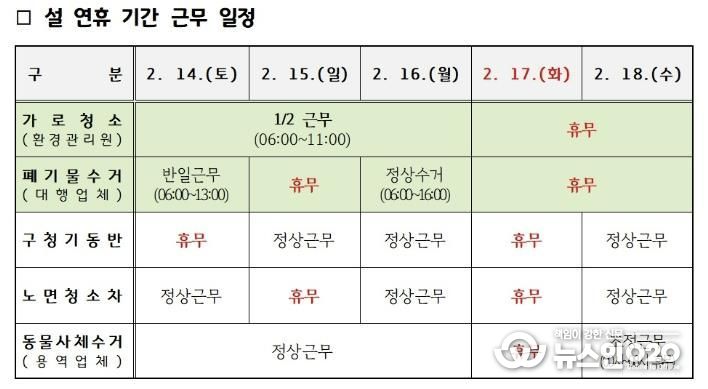 이와 함께 연휴 기간 중 생활폐기물 수거 일정을 공동주택 게시판, 안내방송, 홈페이지 등을 통해 알리고, 음식물 쓰레기 감량과 올바른 분리배출방법도 적극 홍보 예정이다.