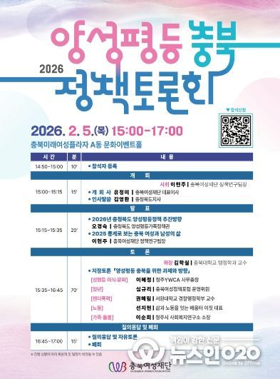 (뉴스인020 = 김성길 기자) 충북여성재단(대표이사 유정미)은 오는 2월 5일 오후 3시, 충북미래여성플라자 A동 문화이벤트홀에서 '2026 양성평등 충북 정책토론회'를 개최한다.