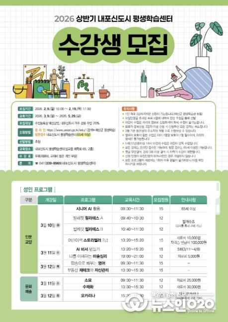 (뉴스인020 = 김성길 기자) 예산군 내포신도시 평생학습센터는 2월 9일부터 19일까지 상반기 프로그램 수강생을 모집하고 3월 9일부터 본격적인 프로그램 운영에 들어간다고 밝혔다.