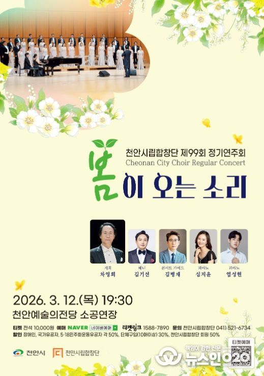(뉴스인020 = 김성길 기자) 천안시립합창단이 오는 3월 12일 천안예술의전당 소공연장에서 제99회 정기연주회 ‘봄이 오는 소리’를 개최한다.