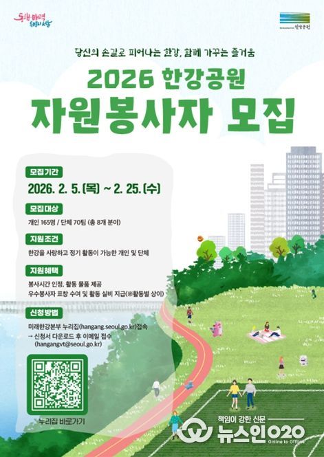 (뉴스인020 = 김성길 기자) 서울시 미래한강본부가 시민의 손길로 한강의 가치를 피워내고 함께 가꾸는 즐거움을 공유할 ‘2026년 한강공원 정기 자원봉사자’를 모집한다. 접수 기간은 2월 5일부터 2월 25일까지 약 3주 간이다.