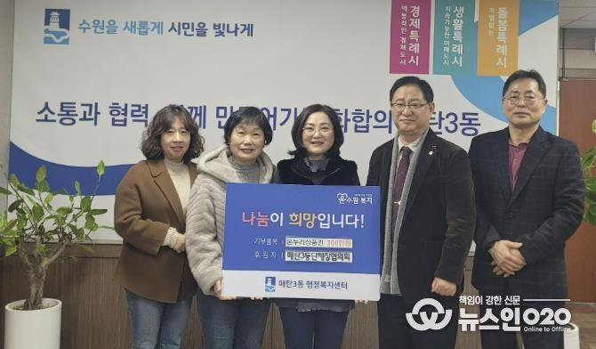 (뉴스인020 = 김성길 기자) 수원시 영통구 매탄3동은 지난 3일 매탄3동 단체장협의회가 다가오는 설 명절을 맞아 관내 어려운 이웃들을 위해 누리상품권 300장(총 300만원 상당)을 기부했다고 밝혔다.