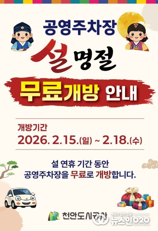 (뉴스인020 = 김성길 기자) 천안도시공사는 설 연휴기간 공영주차장을 무료로 개방한다고 5일 밝혔다.