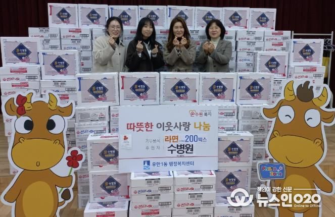 (뉴스인020 = 김성길 기자) 수병원은 지난 4일, 설 명절을 맞아 어려운 이웃들을 위해 라면 200박스를 우만1동 행정복지센터에 기부하며 이웃사랑을 실천했다.