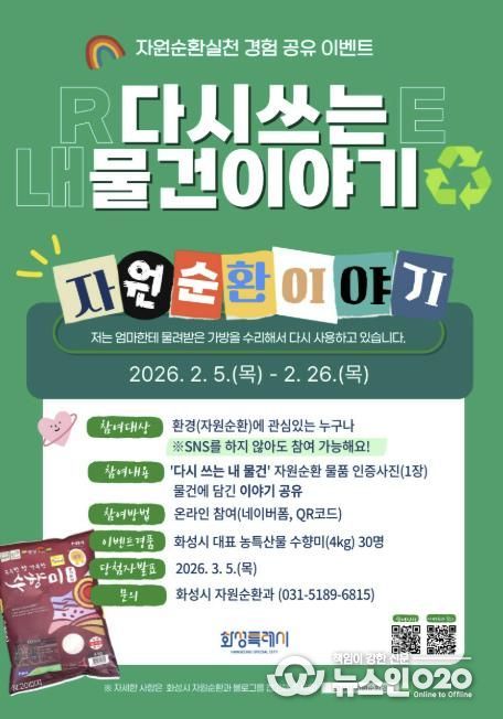 (뉴스인020 = 김성길 기자) 화성특례시는 시민들이 일상에서 실천하고 있는 자원순환 경험을 공유하는 참여형 캠페인 '다시쓰는 내 물건 이야기' 를 운영한다.