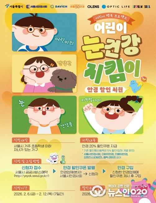 (뉴스인020 = 김성길 기자) 서울시가 새 학기를 맞아 스마트폰 등 디지털 기기를 자주 접하는 어린이들의 눈 건강을 위해 눈 검진(시력검사)과 최대 20%의 안경 구입 할인을 지원하는 ‘서울 어린이 눈건강 지킴이 사업’ 1차 신청을 받는다.