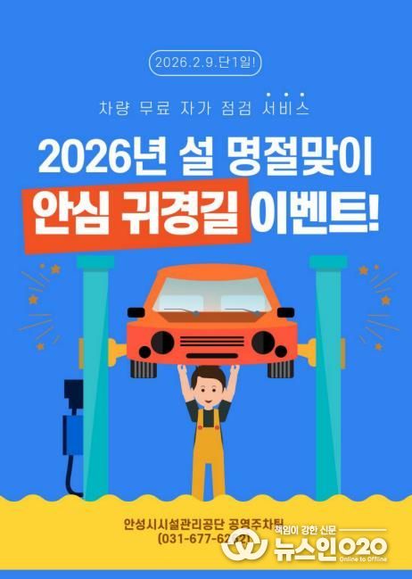 (뉴스인020 = 김성길 기자) 안성시시설관리공단은 오는 2월 9일 오전 10시부터 아양지구 제2공영주차장(경기도 안성시 옥산동546)에서 2026년 설 명절을 맞이하여 공영주차장 이용객과 지역 주민을 대상으로, 차량 무료 자가 점검 서비스 ‘안심 귀성길’캠페인을 추진한다고 밝혔다.