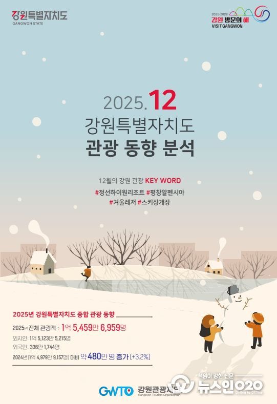 (뉴스인020 = 김성길 기자) 강원관광재단은 빅데이터 기반의 강원관광 동향분석을 통해 강원특별자치도를 방문한 2025년 전체 관광객은 전년 대비 약 480만 명(3.2%) 증가한 약 1억 5,460만 명이라고 밝혔다.